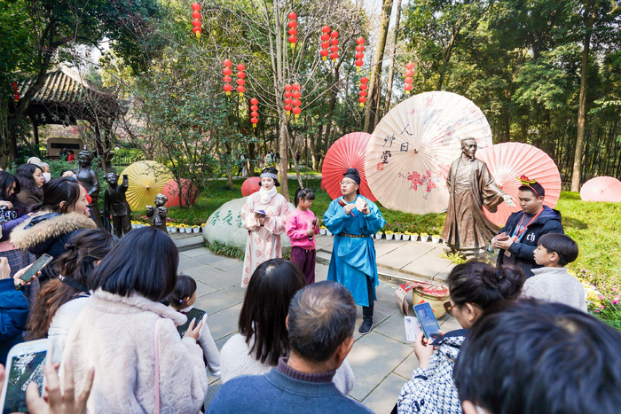 除了背诗活动,杜甫草堂还准备了不少新春趣味活动。2月10日-16日(正月初一至正月初七)期间,在春夜喜雨园有草堂新春市集。