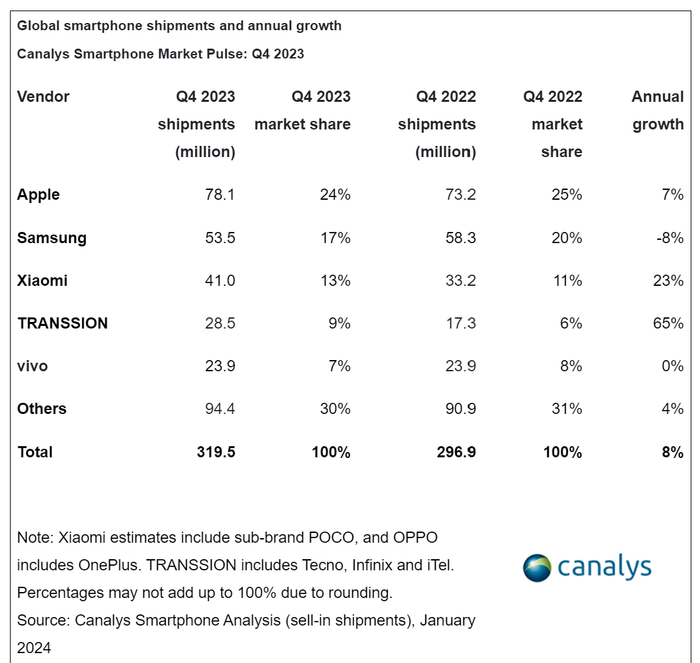 根据Canalys的研究,全球智能手机市场在2023年第四季度同比增长8%,达到3.195亿部,进一步显示出稳定和复苏的迹象。2023年全年的总出货量为11.4亿部,与2022年相比下降了4%。尽管核心市场面临挑战,但苹果在2023年以20%的市场份额和2.292亿部的出货量首次占据榜首。三星紧随其后,以保持盈利为战略,出货量为2.254亿部,占20%的市场份额。小米巩固了第三的位置,以1.464亿部的出货量占13%的市场份额。OPPO和传音分列第四和第五,市场份额分别为9%和8%。