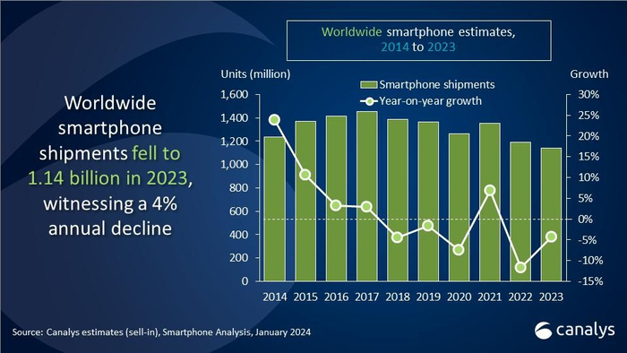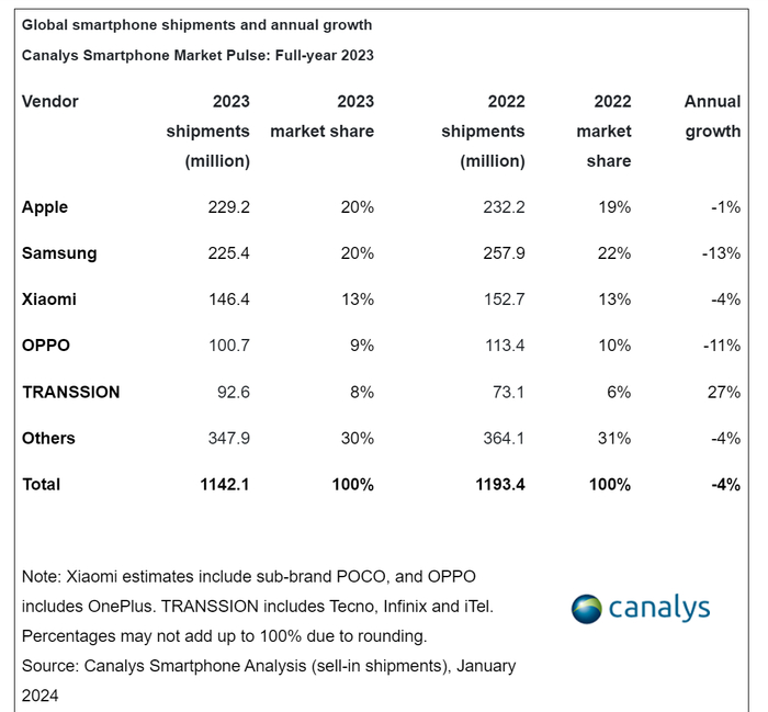 Canalys:2023年全球智能手机出货量11.4亿部