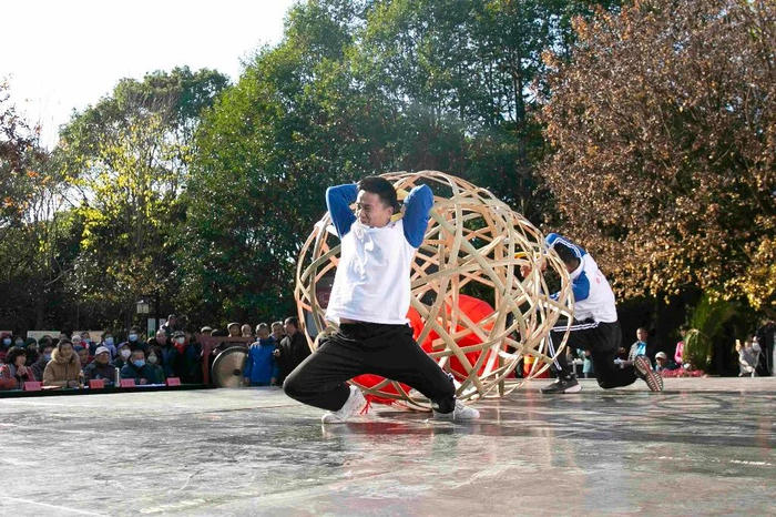 “表演者将巨大的滚球抛起,用嘴巴里含着的竹板接住,还时不时将球向上颠起。表演过程中,铁树银花、火花四溢,显得既刺激又热闹。”一位观众介绍说,滚灯舞的花样繁多,其中“缠腰”“蜘蛛放丝”等十多套大灯动作集旋、跃等多种技巧于一体。其中,“蜘蛛放丝”和“金猴嬉球”等高难度动作,让观众直呼精彩。