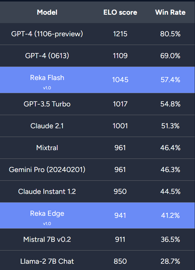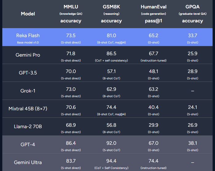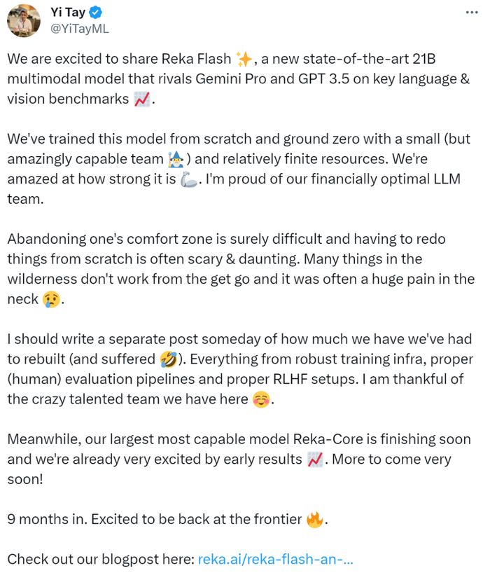 「很高兴与大家分享 Reka Flash,这是一种具有 SOTA 性能的、全新的 21B 多模态模型,该模型在语言和视觉基准方面可与 Gemini Pro 和 GPT 3.5 相媲美。我们用相对有限的资源从零开始训练这个模型…… 与此同时,我们规模最大、功能最强的模型 Reka-Core 也即将完成,大家可以对我们接下来的工作期待一下。」