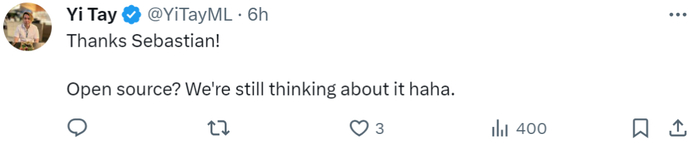 随着时间的推移,刚刚,Yi Tay 宣布他们发布了新模型: