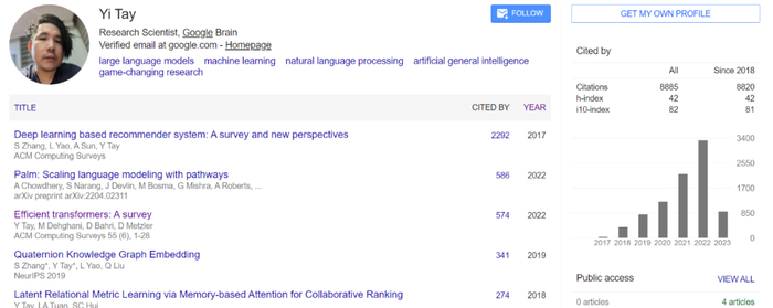 根据 Yi Tay 个人资料统计,在谷歌大脑工作的 3 年多的时间里,他总共参与撰写了大约 45 篇论文,是其中 16 篇的一作。一作论文包括 UL2、U-PaLM、DSI、Synthesizer、Charformer 和 Long Range Arena 等。