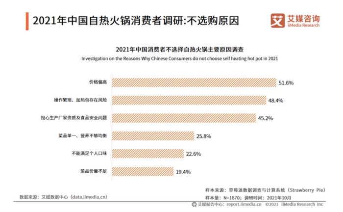 根据艾媒咨询2021年的一份关于“消费者不选购自热火锅原因”的调查问卷中,消费者认为价格偏高是主要原因,占比达到了51.6%。