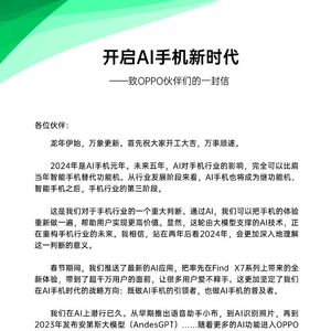 OPPO创始人、总裁、CEO陈明永发表了名为《开启AI手机新时代》的内部信。陈明永认为,2024年是AI手机元年。未来五年,AI对手机行业的影响,可以比肩当年智能手机替代功能机。