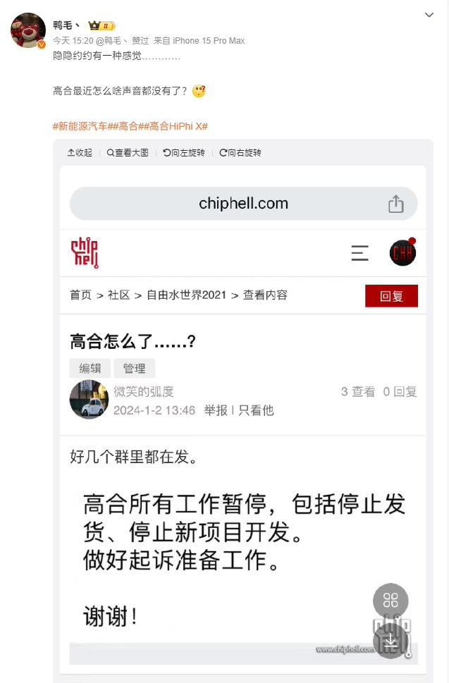 而在今年 1 月,曾由多名博主晒出论坛截图,图中网友声称“高合所有工作暂停,包括停止发货、停止新项目开发,做好起诉准备工作”,消息来源疑似为供应商。据界面新闻报道,高合汽车内部人士表示,上述消息“纯属谣言”,工作“一切正常”。