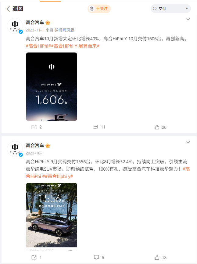 高合汽车最近一次公布月交付量还是在去年 11 月:HiPhi Y 10 月交付 1606 台,再创新高。此后,官方并未公布 11 月、12 月、今年 1 月的交付成绩。