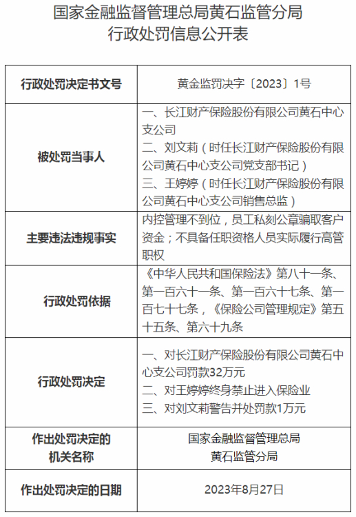 具体来看,2023年8月27日,国家金融监督管理总局黄石监管分局公布一则行政处罚信息公开表(黄金监罚决字〔2023〕1号),长江财产保险股份有限公司黄石中心支公司因存在内控管理不到位,员工私刻公章骗取客户资金;不具备任职资格人员实际履行高管职权等违法违规行为,被黄石监管分局罚款32万元。