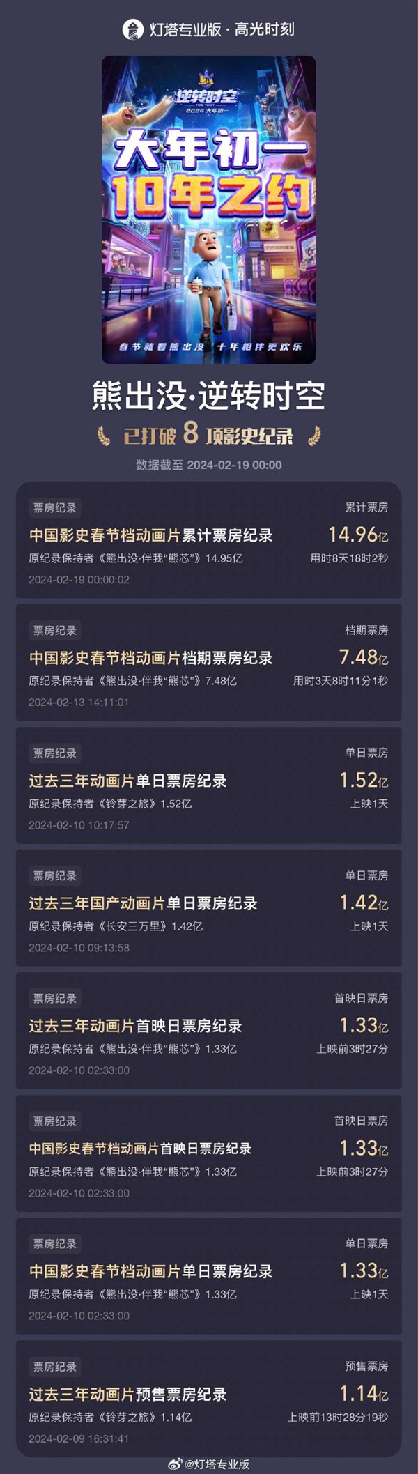 截至2024年2月19日,《熊出没·逆转时空》共打破8项影史纪录:
