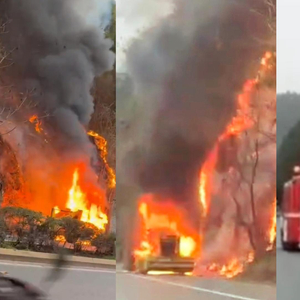 根据网友拍摄的视频显示,公路边停着一辆黄色工程机械车辆,整个驾驶室在剧烈地燃烧,旁边的山坡上也有大量杂草树木在燃烧中,浓烟冲天,过往车辆纷纷避让行驶。另有视频显示,多辆消防车赶到现场,消防队员利用水带奋力扑火。