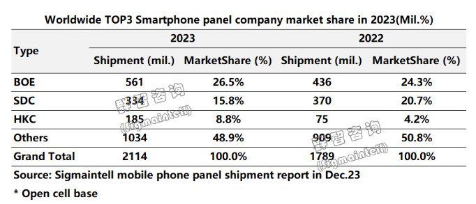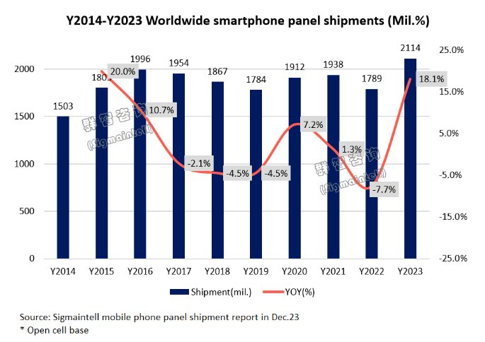 2023年全球智能手机面板出货约21亿片 同比增幅约18%