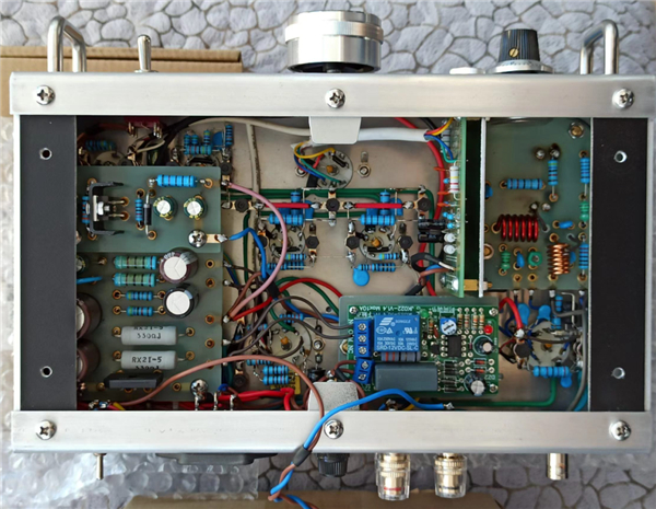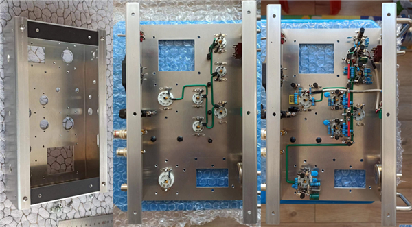 这台收音机的制造者就是,他一点点说明自己是怎么搭建内部架构的:“ 连接灯丝针脚开始焊电路,高放的管座部分和 3 级中放、检波、音频放大部分没有太大的元件,采用搭棚方案,用尼龙柱和焊片做搭棚架,最多的搭了 4 层。虽然件很多,但保证横平竖直,密而不乱 ” 。