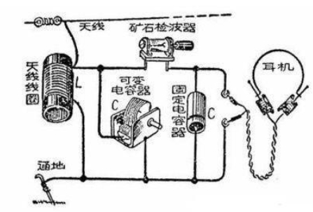 原理是,利用接收无线电波后,利用矿石的单向导电性检波,再由电容滤除高频信号,推动高阻抗耳机发出声音。