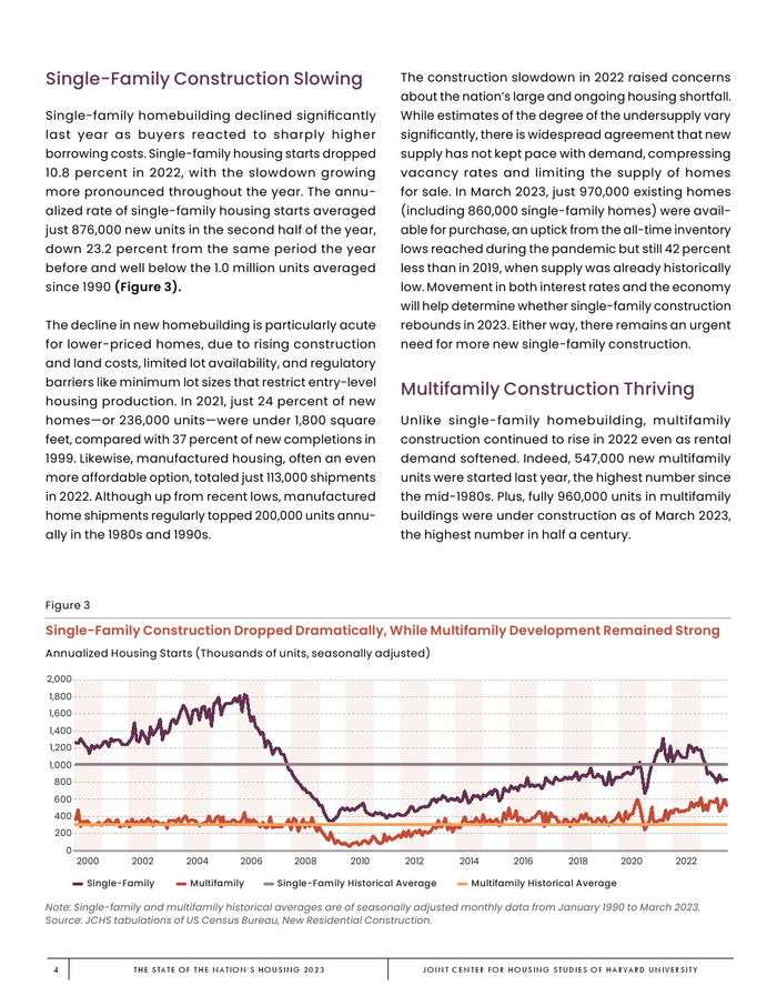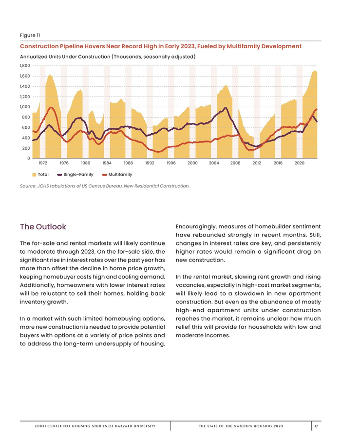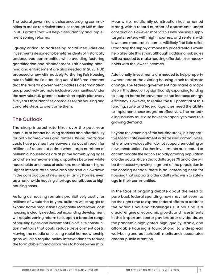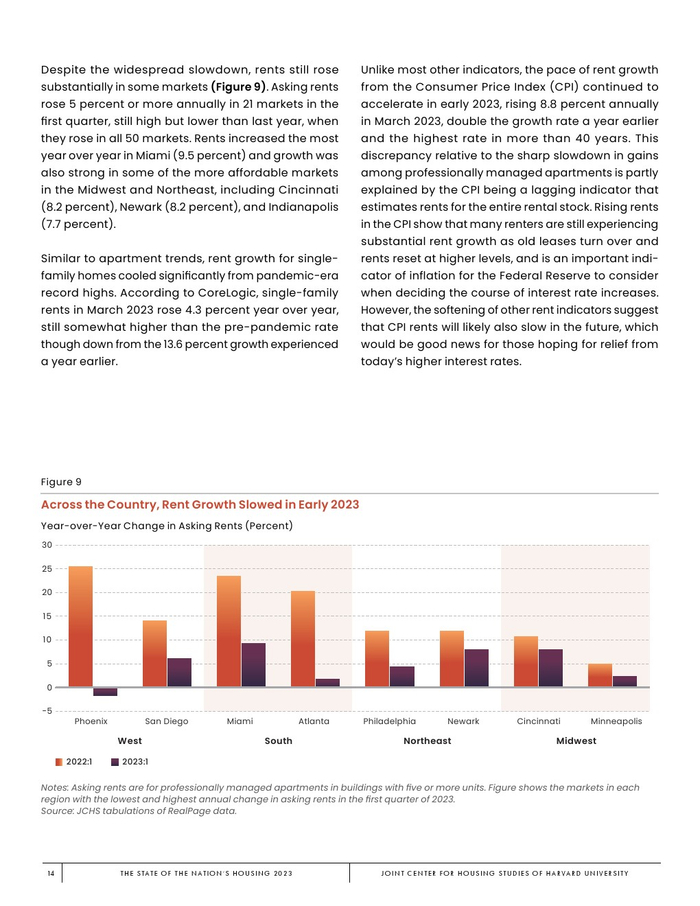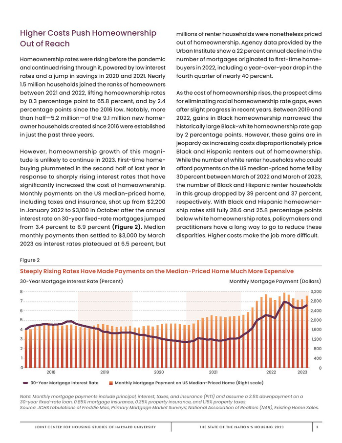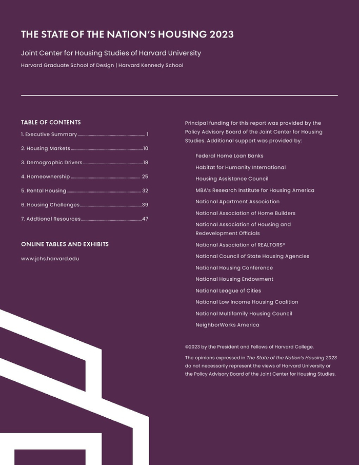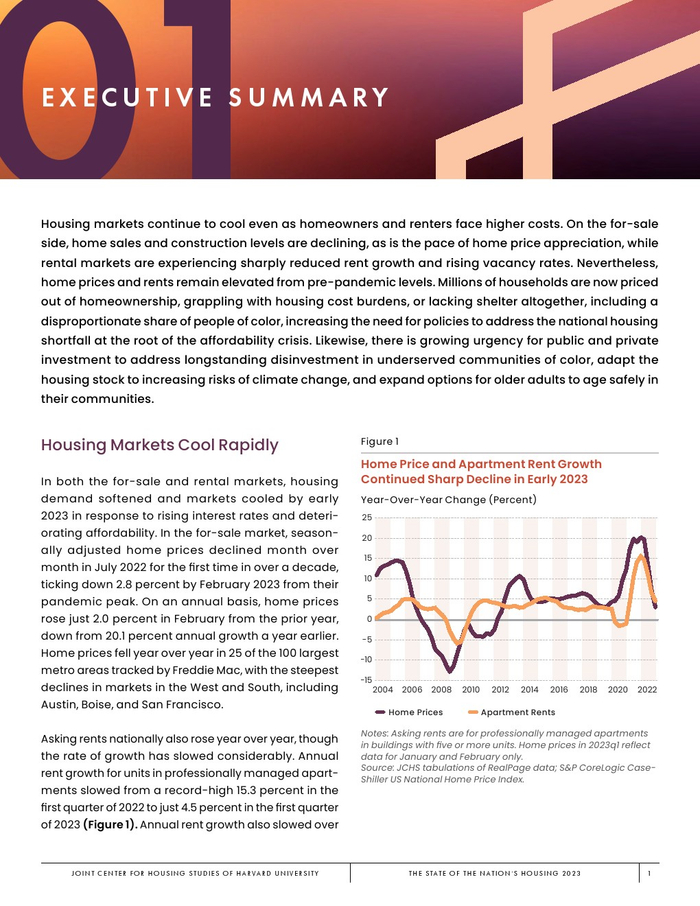 哈佛大学住房研究联合中心发布了“2023年美国住房报告”。尽管房主和租房者面临更高的成本,但房地产市场仍在继续降温。在待售方面,房屋销售和建设水平正在下降,房价上涨的速度也在下降。美国市场正在经历租金增长急剧放缓和空置率上升。尽管如此,房价和租金仍高于大流行前的水平。数以百万计的家庭现在因房价过高而失去了住房所有权,或与住房成本负担作斗争,或完全没有住房,其中包括不成比例的有色人种,这增加了解决国家住房短缺的政策需求,这是负担能力危机的根源。