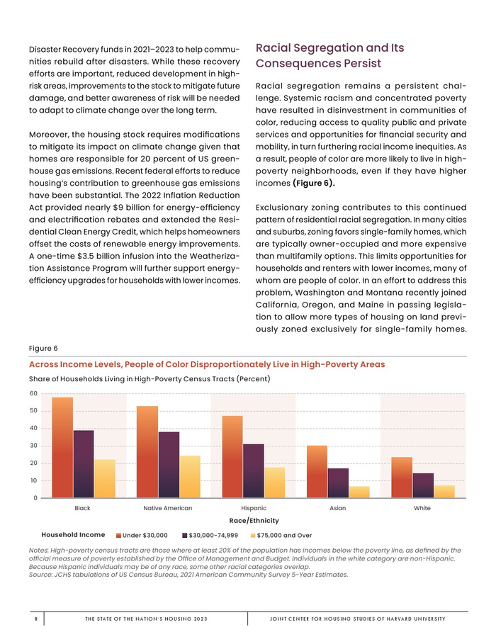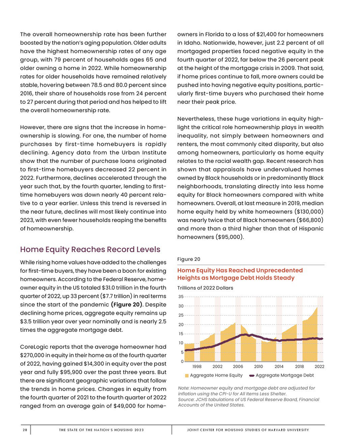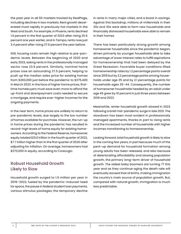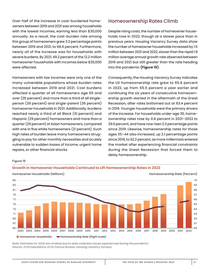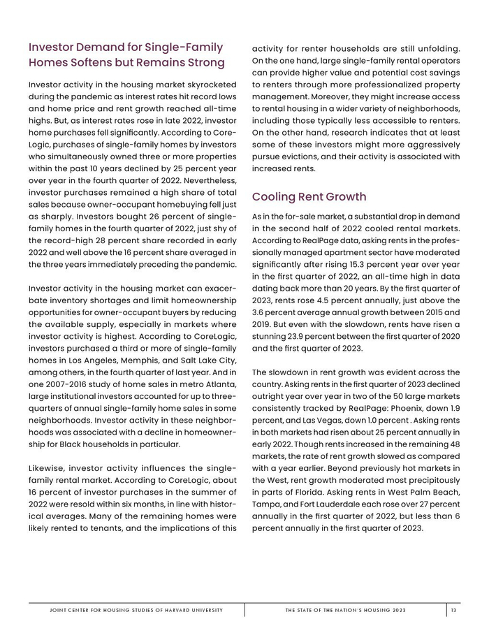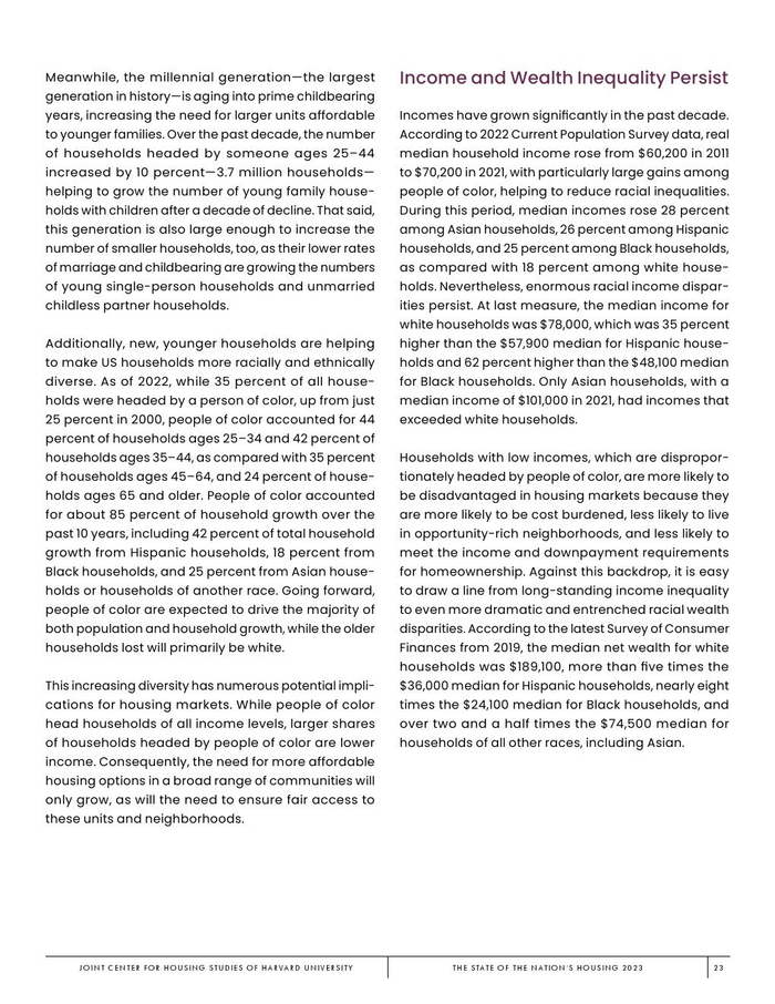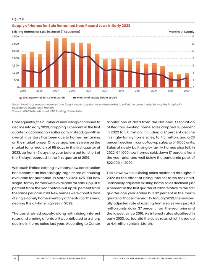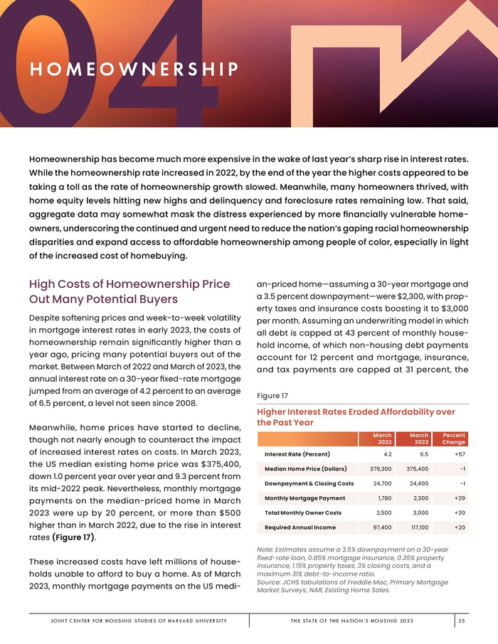 哈佛大学住房研究联合中心发布了“2023年美国住房报告”。尽管房主和租房者面临更高的成本,但房地产市场仍在继续降温。在待售方面,房屋销售和建设水平正在下降,房价上涨的速度也在下降。美国市场正在经历租金增长急剧放缓和空置率上升。尽管如此,房价和租金仍高于大流行前的水平。数以百万计的家庭现在因房价过高而失去了住房所有权,或与住房成本负担作斗争,或完全没有住房,其中包括不成比例的有色人种,这增加了解决国家住房短缺的政策需求,这是负担能力危机的根源。