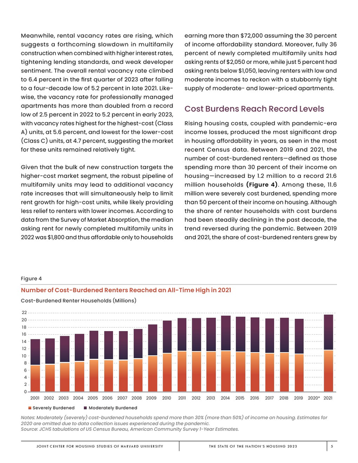 2019年至2021年期间,负担沉重的租房者(定义为将超过30%的收入用于住房的家庭)的数量增加了120万户,达到创纪录的2160万户。其中,1160万户负担沉重,将超过50%的收入用于住房。2019年至2021年期间,负担沉重的租房者占租房家庭的比例增长了2.6个百分点,达到49%,接近大衰退后2011年51%的峰值。