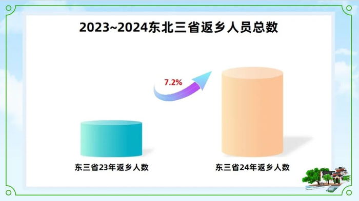 2024年春节期间,东北三省返乡人数达到了近3年的最高峰,对比23年春节增长了7.2%。这不仅反映了返乡大军的规模,也促进了地方特色美食和冰雪文化活动的发展,为乡村经济和文化的振兴提供了动力。
