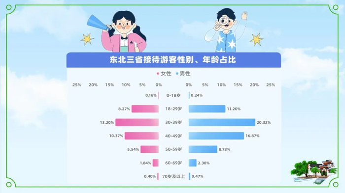 接待游客中首次到访东北三省的游客占比32.72%,每3个人中就有1个是被冰雪游吸引而首次踏上这片东北大地。游客中男性群体居多,占比达59.97%,其中主力旅游人群是30岁至39岁之间的男性群体。