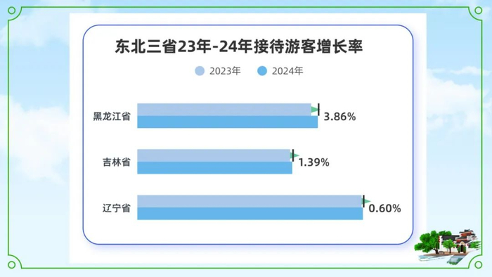 中国电信大数据显示,2024年春节期间,黑龙江省、吉林省、辽宁省全省接待游客较23年春节期间增长1.84%,其中黑龙江省增长率最高达3.86%;