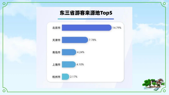 在所有到访东北的游客中,北京市成为第一大客源地,占比达到14.79%,天津市、青岛市紧随其后。天气再寒冷也抵挡不住东北乡村“铁锅炖”“鸡架”的诱惑,天南海北的游客聚集于此共享饕餮盛宴。