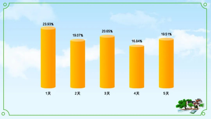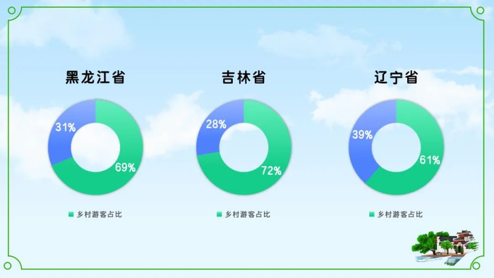 东北三省接待游客中有67.51%的游客选择了乡村游,其中吉林省的游客乡村游比例最高达到了72.3%,吉林乡村的美丽雪景和热闹的生活气息吸引着来自全国四面八方的游客。