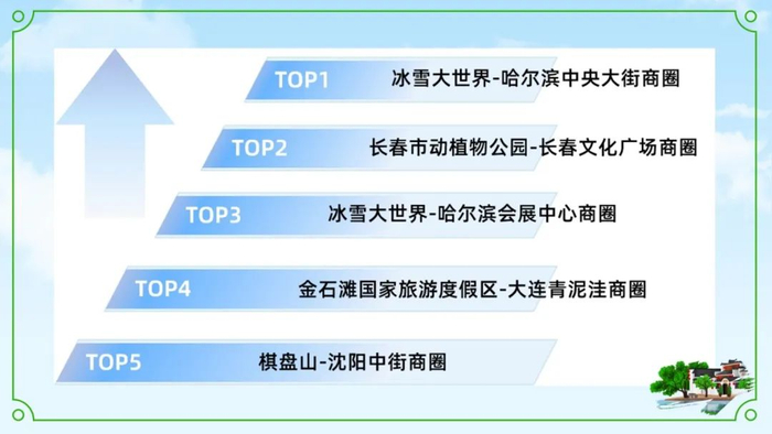 到访景区的人中有55.6%的游客到访了东北当地的主要商圈,其中以冰雪大世界-哈尔滨中央大街的线路最为热门。目标为乡村游的游客对于东北城市商圈经济的消费拉动作用也尤为明显。