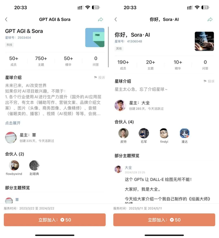 据不完全统计,目前知识星球上共有19个与Sora相关的星球,7个需要付费才能加入,这些需要支付费用加入的星球大多成立才5天。