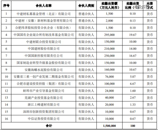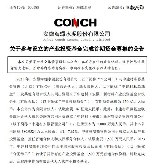 据过往公告,2021 年,安徽海螺水泥股份有限公司与中建材私募基金管理(北京)有限公司(普通合伙人、基金管理人,简称“中建材私募基金”)及其他有限合伙人共同出资设立了中建材(安徽)新材料产业投资基金合伙企业(有限合伙),首期基金规模为150亿,海螺水泥作为有限合伙人,认缴出资16亿元。