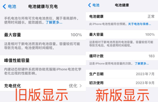 更新系统后新增的显示电池状态有了“正常”显示,能够让用户更直观地了解当前iPhone的电池健康状态,点击该菜单还可显示详细的电池健康信息,如最大容量百分比和充电循环次数,在此之前充电循环次数只能在设备的“关于”菜单中看到。