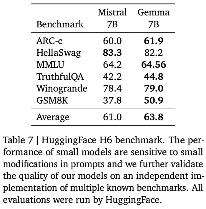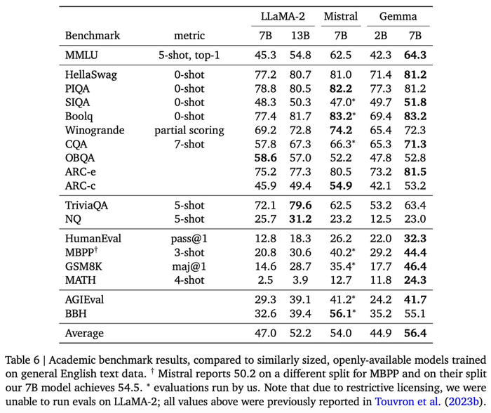 尽管体量较小,但谷歌表示 Gemma 模型已经「在关键基准测试中明显超越了更大的模型」,对比的包括 Llama-2 7B 和 13B,以及风头正劲的 Mistral 7B。