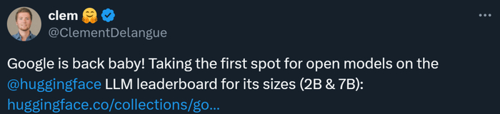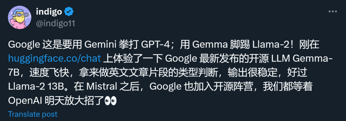 谷歌这次没有预告的开源,或许是想抢在 Meta 的 Llama 3 之前一天,毕竟此前有消息称 Llama 系列本周就要上新(让我们期待第一时间的评测对比)。