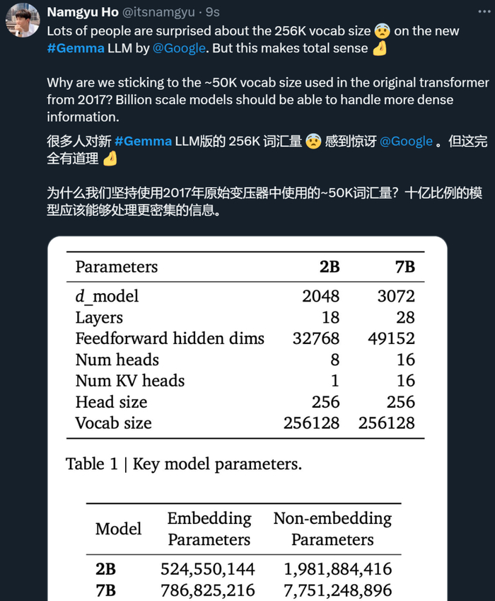 在开源模型的同时,谷歌还公布了有关 Gemma 的性能、数据集组成和建模方法的详细信息的技术报告。在技术报告中,其他研究者发现了一些亮点,比如 Gemma 支持的词汇表大小达到了 256K,这意味着它对英语之外的其他语言能够更好、更快地提供支持。