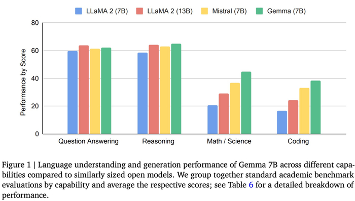 下图 1 为 Gemma(7B)与 LLaMA 2(7B)、LLaMA 2(13B)和 Mistral(7B)在问答、推理、数学和科学、编码等任务上的性能比较。可以看到,Gemma(7B)表现出了优势(除了在问答任务上弱于 LLaMA 2(13B))。