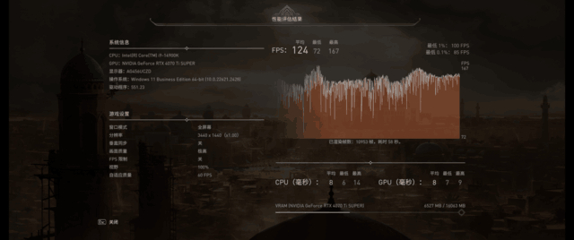 除了赛车游戏,笔者还用AG456UCZD这款显示器体验了《刺客信条:幻境》,画面设置同样为默认全最高,开启DLSS质量,在游戏自带的BenchMark中进行测试,此时游戏的平均帧率维持在124帧,完全能够满足流畅运行的需求,但是想要完全跑满这款显示器,可能就得适当降低游戏画质,如果是你,你会为了更高的帧数牺牲游戏画质吗?欢迎大家在评论区留言。