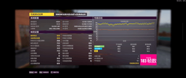 笔者测试的第一款游戏就是最适合曲面屏显示器的《极限竞速:地平线5》,作为目前开放世界娱乐赛车的巅峰,直到现在市面上都几乎没有能和它同台竞技的同类型游戏作品,即使是育碧全新升级的《飙酷车神:轰鸣盛典》在笔者看来也要略逊一筹。在显示器原生分辨率下,画面设置为默认全最高,开启DLSS质量挡,在游戏自带的Benchmark中进行测试,测试结果如下图所示。