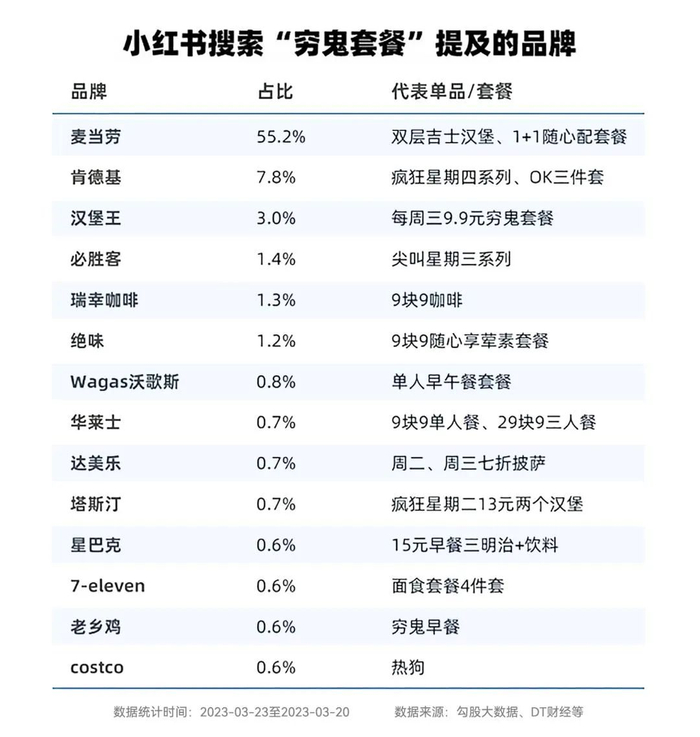 事实上,过去一年“穷鬼套餐”火遍全网,用来形容高性价比和价格便宜的套餐组合。这一词最早从麦当劳、塔斯汀等西式快餐连锁开始流行,后来推广至中餐、早点等领域。甚至有网友总结了“穷鬼”的一周菜单。