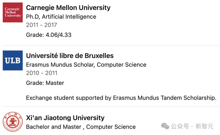 他本科毕业于西安交通大学,研究生毕业于布鲁塞尔自由大学,博士毕业于 CMU。