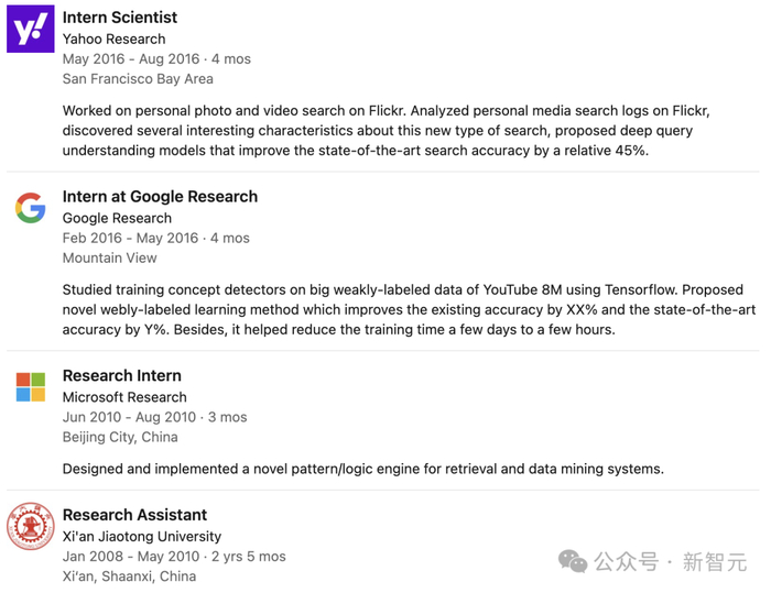 他在雅虎、谷歌和微软研究院的实习时,得到了 Liangliang Cao 博士、Yannis Kalantidis 博士、Sachin Farfade、Paul Natsev 博士、Balakrishnan Varadarajan 博士、Qiang Wang 博士和 Dongmei Zhang 博士等人的指导。