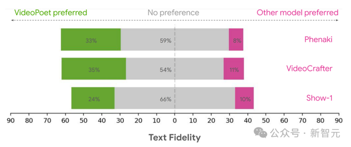 综上可见,平均有 24-35% 的人认为 VideoPoet 生成的示例比其他模型更加遵循提示,而其他模型的这一比例仅为 8-11%。