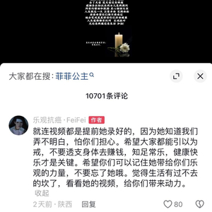 2月21日凌晨1点30分,“菲菲公主”的家人用菲菲的抖音账号发布了一则讣告,称菲菲在2月20日离开人世,同时感谢粉丝在菲菲患病期间的帮助和鼓励,同时提醒网友“人生就这一次,注意身体,定期体检”。不少网友在评论区表示,愿她“一路走好,天堂没有病痛”。