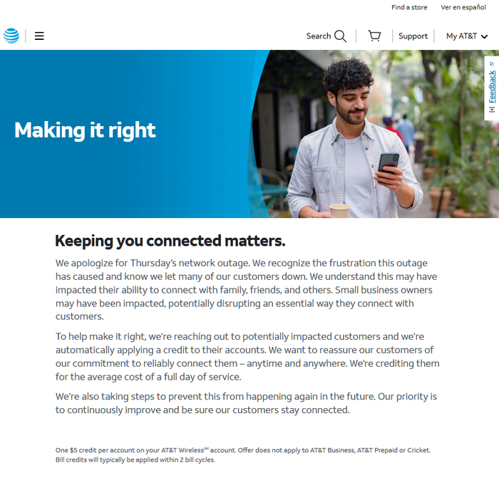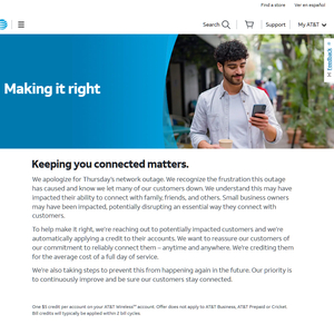 作为补救措施,AT&T 宣布将为所有 AT&T 客户提供 5 美元话费补贴(IT之家注:以信用额度形式提供),会在未来两个账单周期内发放。需要注意的是,持有 AT&T Business、AT&T Prepaid 或 Cricket 账户的用户将不会获得任何补偿。