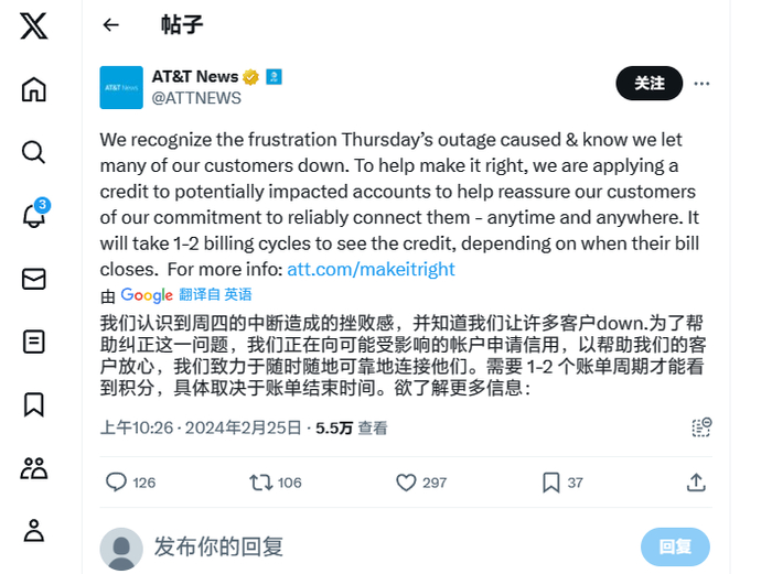 AT&T 在其官网更新了公告:“我们理解,这可能影响了许多客户与家人、朋友或其他人联系的能力。小商业主可能受到影响,还会破坏他们与客户联系的重要方式。”