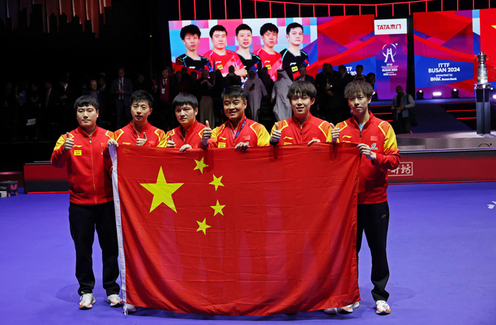 当地时间2024年2月25日,韩国釜山,2024釜山世乒赛男团决赛,中国男乒战胜法国队夺冠。中国队赛后高举五星红旗合影留念 图据视觉中国