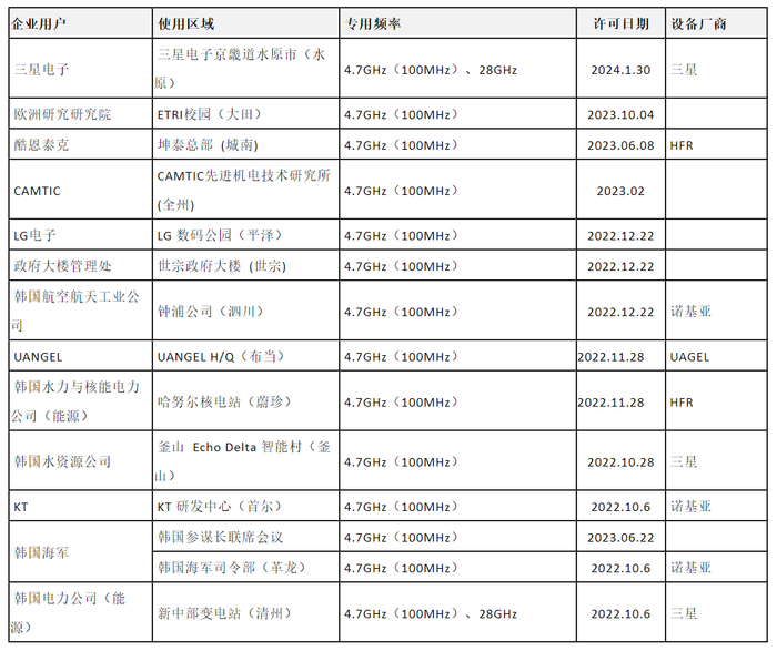 二、韩国5G专用频率许可情况