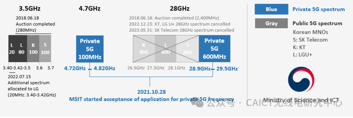 韩国采用行政许可方式向两类对象许可5G专用频率。一类是5G专网运营商,由MSIT批准成为的5G专网运营商,可以申请获得专用频率,向企业客户提供专网服务。另一类是企业用户,企业向MSIT申请专用频率自建5G专网。需要注意的是,出于反垄断考虑,政府禁止公网运营商运营专网,所以韩国公网运营商(SK Telecom、KT和LG U+)不能作为专网运营商申请频率。韩国还推出了一个简化的行政许可流程,方便企业更快获取频谱。为了鼓励使用毫米波频段,MSIT制定的28GHz频段频率分配费和使用费显著低于4.7GHz频段。