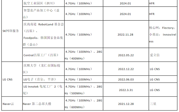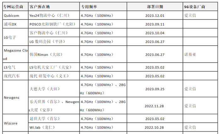 截至2024年1月,MSIT已向31家专网运营商和企业发放了5G专用频率许可,在56个区域进行部署。其中有18家专网运营商获得了4.7GHz或(和)28GHz频段频率许可,主要在物流中心、园区、工厂、高校、医院等场景部署使用,部分专网运营商情况如下表所示: