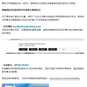 2月27日,复旦美国校友会通过微信公众号发布了帮助孙卫东博士志愿者团队的最新通告。