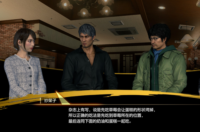 举个例子,如果你在某个餐厅点了合适的套餐,就会触发一场队友对话,他们会针对“草莓蛋糕到底是先吃奶油还是先吃蛋糕”展开了一场小讨论,最后纱荣子用“杂志上看来的专家说法”终结了争论。