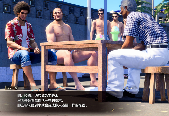 如龙前几代有一个系列彩蛋任务,是说有历史悠久的黑道小组叫权田原组,从组长到组员,都癖好奇特,喜欢裸着身体穿着纸尿裤叼着奶嘴Cos婴儿,从而受到护士小姐姐的照顾,乐此不疲。因为场面过于辣眼睛,不小心碰到他们的朋友应该是过目不忘的。