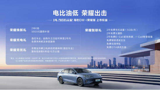 海豹DM-i荣耀版全系起售价格低至14.98万,在前期购车上实现“电比油低”、直刺合资中型轿车“底线”,让消费者花更少的购车成本,拥有远超同级合资车型的标杆级高价值体验;同时,在DM-i超级混动技术加持下,海豹DM-i荣耀版实现了用车成本上的“电比油低”, 其提供121km和200km两种纯电续航里程(NEDC工况),亏电油耗低至百公里3.9L,极大降低了用户的日常用车成本。